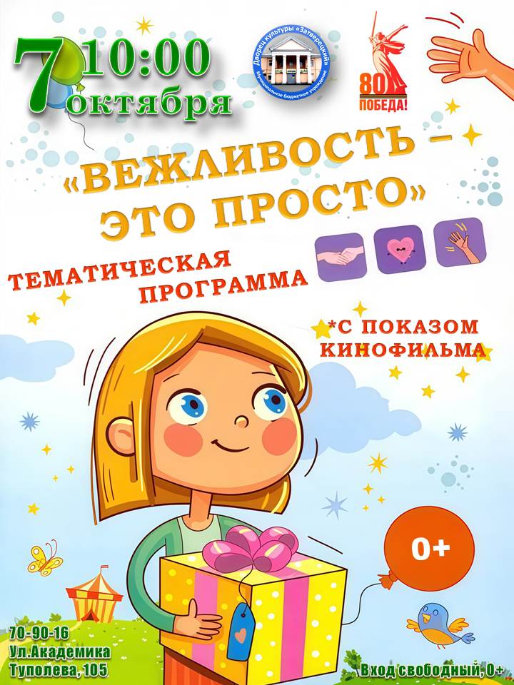 Юных гостей ждет динамичный киноУрок: они не просто посмотрят добрый тематический мультфильм, но и станут его активными участниками. Вместе с ведущим дети отправятся в путешествие по стране «волшебных слов»: разгадают загадки, сыграют в вежливые игры и помогут героям на экране сделать правильные выводы.