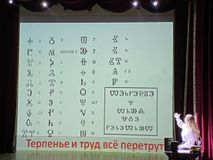 Ведущая познакомила представителей подрастающего поколения с историей возникновения письменности славян (от времен первобытных людей до 9 века, момента создания славянской азбуки). С помощью фото- и видеоматериалов зрителям удалось проследить путь книги от рукописей до книгопечатания, а также подчеркнуть значение заслуги братьев Кирилла и Мефодия в истории просвещения и поднятия общей культуры славянских народов.